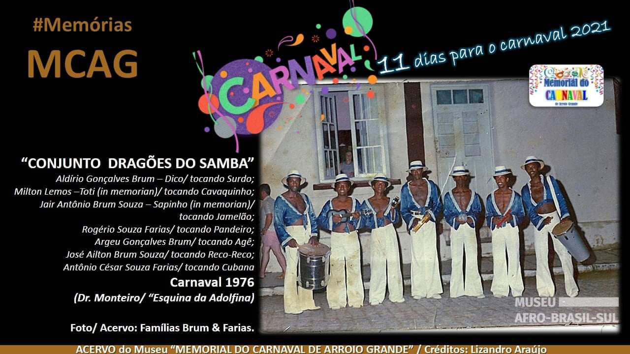 Conjunto Dragões do Samba – 1976 Voltar 04/03/2022 by museuafrobrasilsul   Documento Foto01 Baixar Anexos Foto01 Metadados Miniatura Compartilhe Número de registro0047EstadoRio Grande do SulCidadeArroio GrandeData de Criação Final2021LegendaCONJUNTO DRAGÕES DO SAMBA - 1976 - ARROIO GRANDE.TécnicaFotografiaDigitalizadoSimNato DigitalNãoAutoria de quem reproduziu a digitalizaçãoLizandro AraújoTécnica utilizada na digitalizaçãoEscaneamentoData de digitalização11/06/2021ColeçãoCarnavalDoadorRogério Souza FariasTamanho (MB)161 KbHistórico/contextoPublicação no Memorial do Carnaval de Arroio Grande sobre o Conjunto Dragões do Samba - carnaval de rua em Arroio Grande, na rua Dr. Monteiro (passarela do samba) - 1976.AutoriaRogério Souza FariasData de Recebimento11/06/2021 Continuar navegando Pedro Martin Pinheiro Lúcio (2anos) filho do Mingau/Banda Nova Farroupilha Banda Nova Farroupilha – 2002 Voltar para a lista de itens